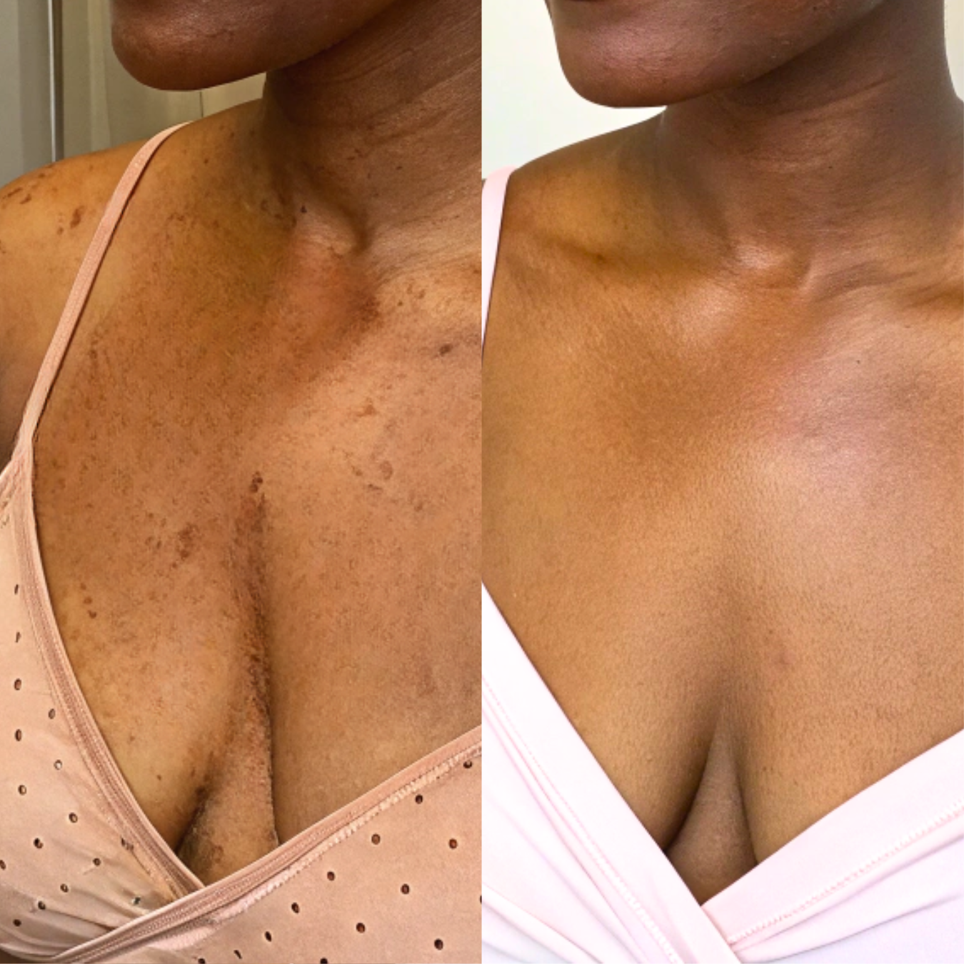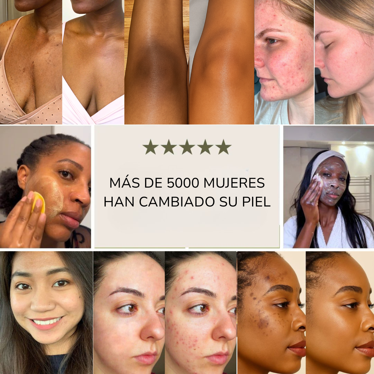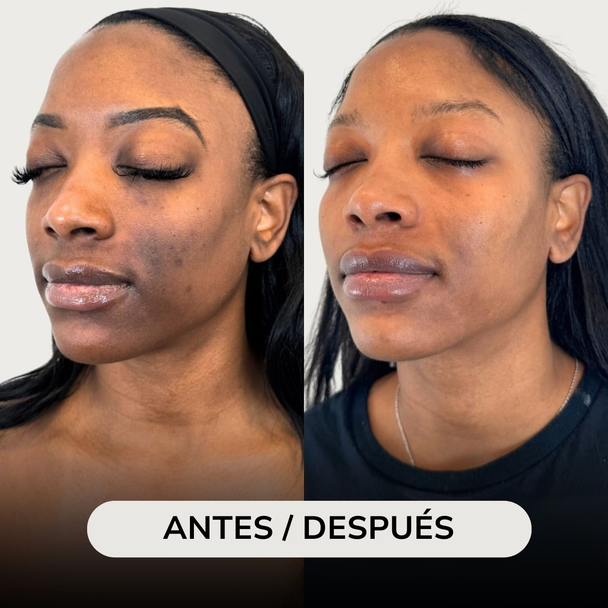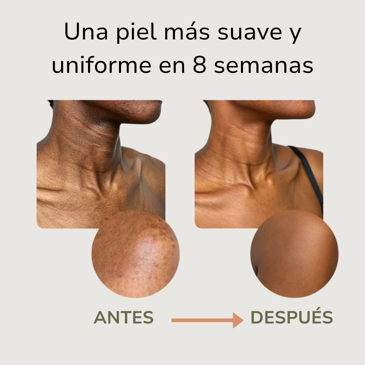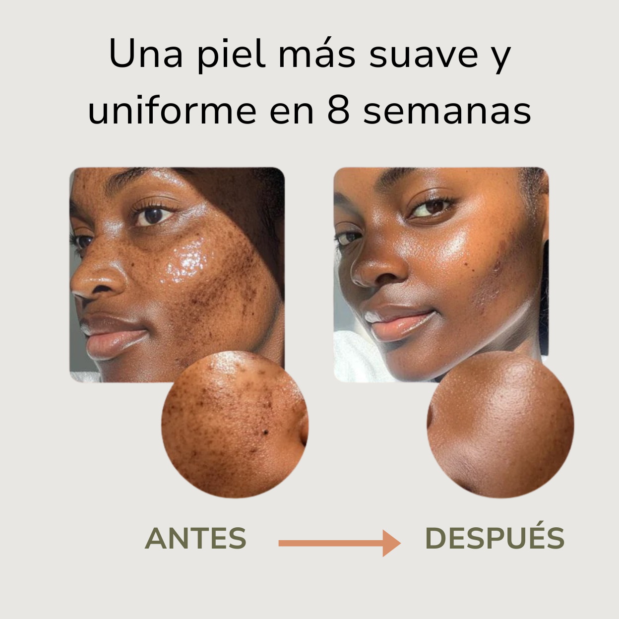 Nuestra fórmula hidrata en profundidad, elimina manchas y unifica el tono, revelando una piel visiblemente más luminosa y radiante.