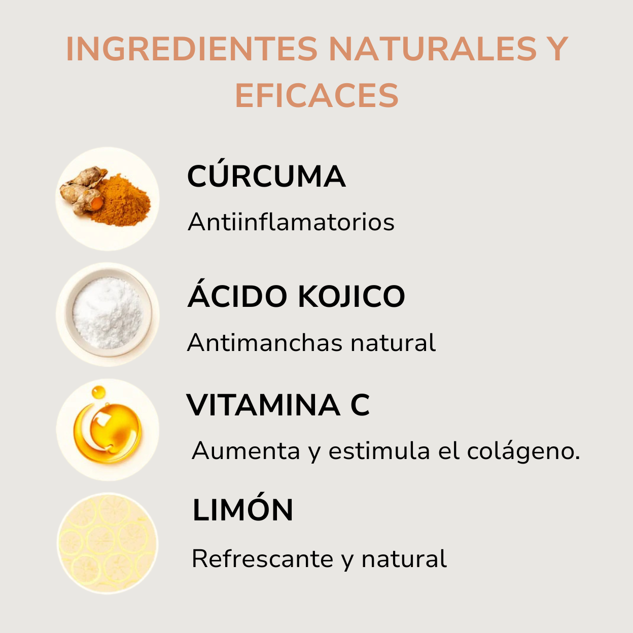 Transforma tu piel con cúrcuma y ácido kójico: elimina imperfecciones, ilumina la piel , controla el acné y revela un tono uniforme y radiante.